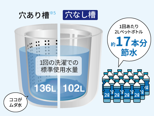 「穴なし槽」のすることで洗濯槽と外槽の間のムダ水をカット。ES-PT10Gが「穴あり曹」だったと仮定した場合、お洗濯1回あたり約34L(2Lペットボトル約17本分)の節水効果があることが分かりました☆